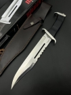 美国联合出品,兰博3高阶量产蓝盒版本,大龙骨一体钢结构,设计师不计成本采用6.0mm厚的A8钢材制作,高温热处理硬度60-62HRC,二次淬火硬度计保持60HRC,韧性很好,经过12刀工序数控水磨加工,手工精细拉丝砂光,刀鞘选用进口头层牛皮制作,加强整体档次效果,收藏、实用、送朋友确实不错的一把宝刀。近乎完美还原史泰龙定制版的设定与细节。1988上映的《第一滴血3》俗称兰博3是广大影迷心中的经典,电影里史泰龙所使用的刀具更是凭借其硬朗的设计深受刀友们喜爱。在电影之外史泰龙也是吉尔忠实的刀粉,基于这次合作吉尔也特别定制了一把兰博3赠送给了史泰龙,此把款式便是史泰龙手中藏品的完美复刻,与电影版有细节区别。