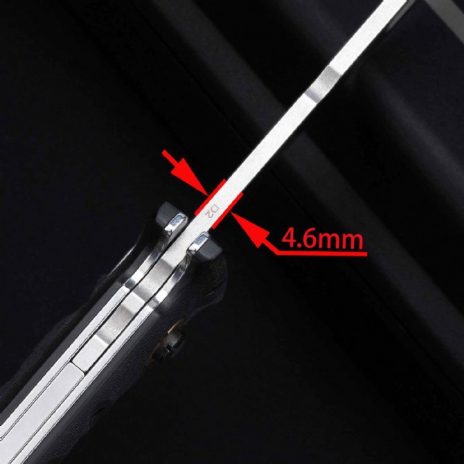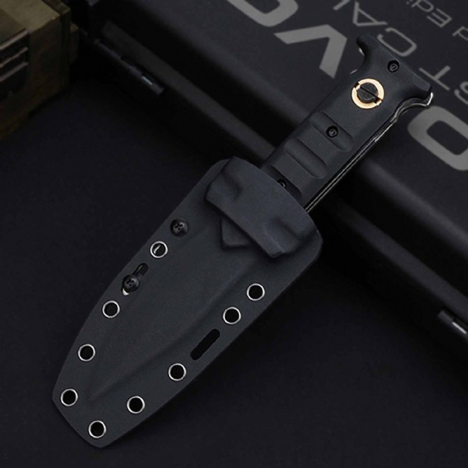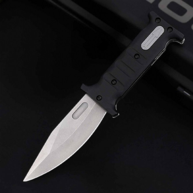 折叠时,刀柄恰好覆盖刀刃的一半,而另一半则伸出刀柄。D2 刀片通过一个大型十字螺栓在打开和关闭时固定,这个十字螺栓也可以在没有工具的情况下拧入手柄中,使刀在完全打开和缩短时都更加耐用,由两块厚钢板和铣削G10制成的手柄,为了多功能使用,刀柄末端有一个坚固的打击钉,这把刀配有一个定制的Kydex鞘