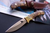 这款刀是勃郎宁非常经典的随身护卫刀,钢材是440C进口日本材料, 手柄采用纯黄铜和影木组合,其中连铆钉都是黄铜的,刀柄的花纹是影木天然特有的,影木是一种非常昂贵的木材,在近期才出现在刀身的应用上.
