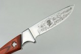 品牌:北美狩猎俱乐部类型: 猎刀全长:21.5cm刃长:10cm刃厚:0.27cm刃宽: 2.6cm刃面:镜光+激光图案柄长:11cm刃材: 7Cr17,一体式柄材: 彩木+钢头硬度: 57HRC总重:264克(含包装)包装:皮套、纸盒。