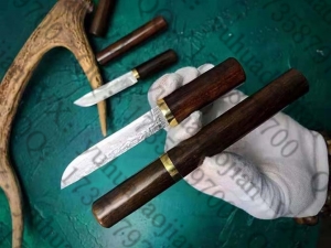 高档迷你版,进口老料黄檀木+进口锻造大马士革钢制作,整木开二,手工制作而成,开刃锋利无比,收藏玩把必备款总长:13.6cm、刀刃:7.5cm。手柄:5cm。刃宽:1.9cm、钢材厚度:3MM、钢材:进口大马士革钢,硬度:59HRC。手柄材质:老料黄檀木、包装:黑色盒
