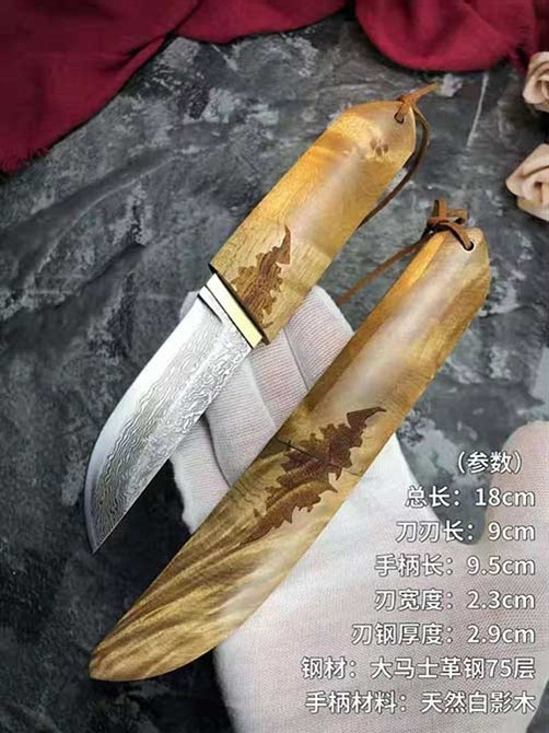 做工极好,所有木材百里精选选材,合鞘不动摇、一刀一木制、独一无二稀奇木纹,VG10大马士革钢75层锻造钢,此刀经多次开刃,非常锋利小心使用,此批数量不多,好货限量发售