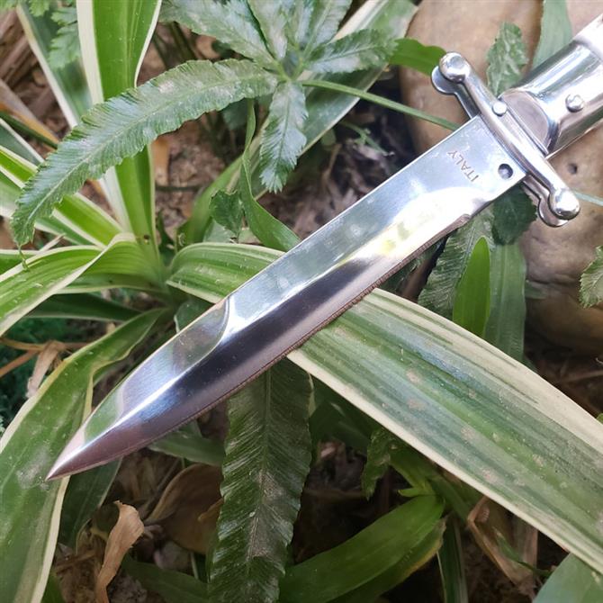 Italy Swinguard 意大利黑手党系列,收藏级别的经典的守护神跳刀,其特色是可摇摆折叠的护手,弹出刀时候护手随即打开形成保护,全钢骨架铆天然鹿角,搭配不锈钢440刀刃, 全手工抛磨,制造精良,纯手工工艺 ,极具收藏价值!规格全长 22.86CM刃长 10CM刃厚 3MM刃材料 440