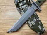 D8刺是其公司限量产,市面上极少,其整体刚劲而刀型优美,外柔内刚的个性使其成为经久不衰的最经典刀款之一。经典源于细节的完美,经典的刀款需要细致完美的生产工艺才能造出一把好刀。一把看似简单的军刀,做好它却需要好的材料、苛刻的生产工艺、精密的模具、一流的配件、理想的表面处理等。如果一把刀的所有配件都是现成的,那装配好一把刀那只是几分钟的事情;但是制作一把刀从准备到做好那可是好几个月或者更长的时间。我们08年下半年的时候就准备做一把理想的军刀,但后来因种种原因就搁浅下来了,直到09年5月份又重新提上议程来。从做图纸、预订材料、做模具等这一切进度都是那么的缓慢。慢的原因很简单,因所有的材料都是定制的,高要求而量少厂家都不太乐意做,所以这也是为什么一款产品售完不再复产的原因。其中最麻烦的就是G10手柄颜色的定制,前后共调了三次颜色,因生产工厂在广州每调一次颜色就得十几天的时间周期,这前前后后两三个月的时间就过去了。刀鞘和刀柄座钢件要各开一套模具,刀柄座钢件的压铸模具还比较好解决,但是刀鞘塑料模具就有技术含量了,为了确保刀鞘质量,其模具由具有警察装备资质的模具厂制造,两个多月的工时不算长,但其高精密度要求的工序是烦琐而复杂的。 主材料(钢材,手柄材料)、辅料(刀鞘的织带,插扣,螺丝……)、模具都安排妥当后就进入刀体制作程序了。D9、D8军刺选用D2钢材,高精密度线切割外形,保证了假刃、刃面打磨及其它刃线的对称性同一致性。该刀从清根到刀尖全是凹磨整体呈S形曲线,并且在清根、刀刃中端、刀尖处三处的打磨宽度不一样,也就是说从清根到刀尖的凹磨角度一直呈复杂的立体变化,而不是简单的凹面变化。所以这部分的打磨必须是手工打磨或CNC做刀刃打磨,这可能也是该刀原版稀少而贵的原因。带涂层的刀具我们都知道其柄片和龙骨边缘之间的配合是个难点,因为柄片装好后不可以再把柄片同龙骨之间配合不好的地方打磨一遍,一打磨龙骨表面的涂层就损坏了。该军刺用军绿G10材料制作手柄,为保证柄片同龙骨边缘的配合精度,手柄全CNC工艺成型,且表面有防滑纹,起防滑手作用;刀刃表面采用先进的珠光钛涂层工艺(非喷沙工艺),其具有超强防腐蚀同消光作用。 好马配好鞍,好刀配好鞘。刀鞘我们也力求最好,就连一个小小的插扣配件,我们选用了世界品牌的美国多耐福插扣,这比普通的插扣价格足足贵了6倍以上。也许在各个方面还有不尽人意的地方,但我们力求做到更好;没有最好,只有更好,现在的水平就是我们在这个环境下能发挥的全力水平了(当然以后还会更好)。我们敢说批量生产产品中D9、D8军刺是现国内最高生产水平的作品之一。类 型: 刺刀 全 长: 32.0cm 刃 长: 19.0cm 刃 宽: 3.7cm(最宽处)柄 长: 12.5cm刃 材: D2钢硬 度: 60 HRC表 面: 钛离子刃 厚: 0.60cm柄 材: 龙骨结构,军绿G10柄片净 重: 540.0g总 重: 1040.0g(包括纸盒和刀鞘)包 装:原装纸盒其 他:配附ABS战术刀鞘品 质: 品质卓越