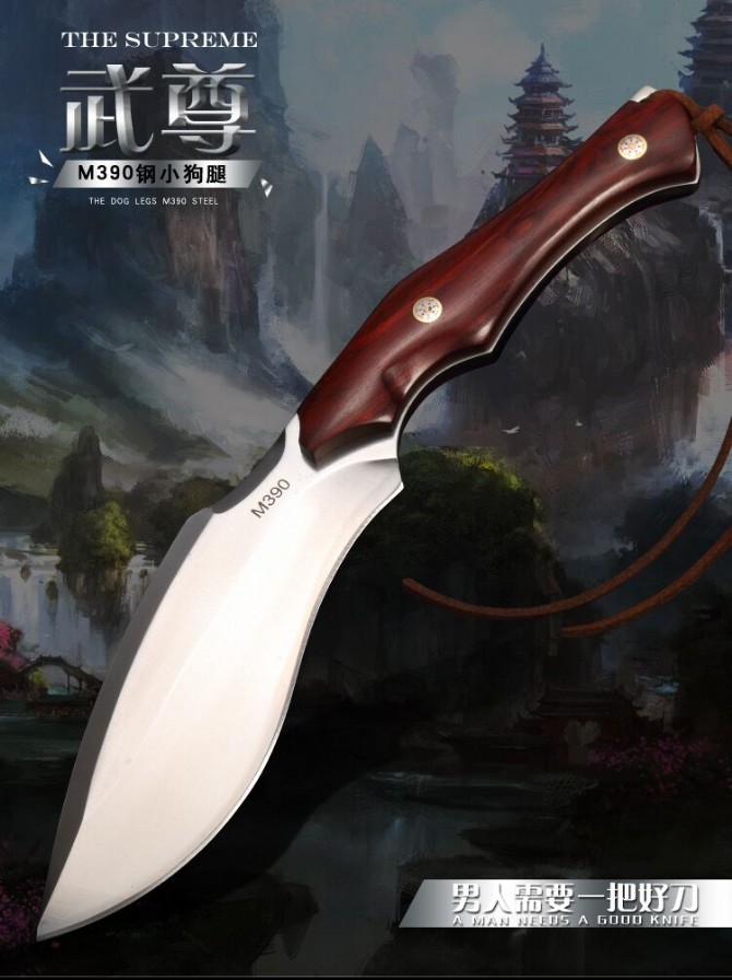 全 长:19.5cm刃 长: 9.8cm刃 宽:4cm刃 厚: 4mm柄 长: 9.7cm刃 材: 进口M390硬 度: 58-60HRC 净 重: 100g总 重:140克(含皮套包装)表 面: 沙光柄 材: 老料微粒黄檀+铜钉其 他: 意大利手工雕花牛皮刀套+礼品盒