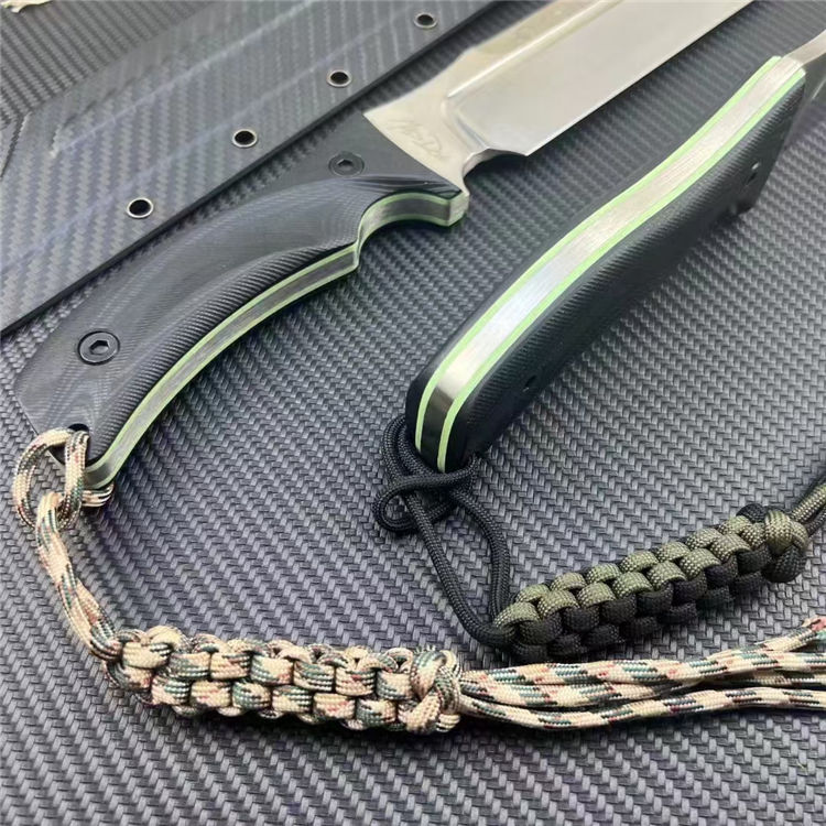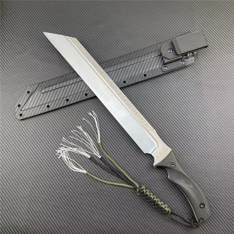 MAD DOG采用了seax叨型,精选O1钢,一条L型沟槽贯穿叨身,刻有“HOLY SWORD VILLA THE GUARDIAN OF THE BROTHERHOOD”字样,镜面开刃使得切割更轻松。黑绿双色G10柄,K鞘外覆碳纤维