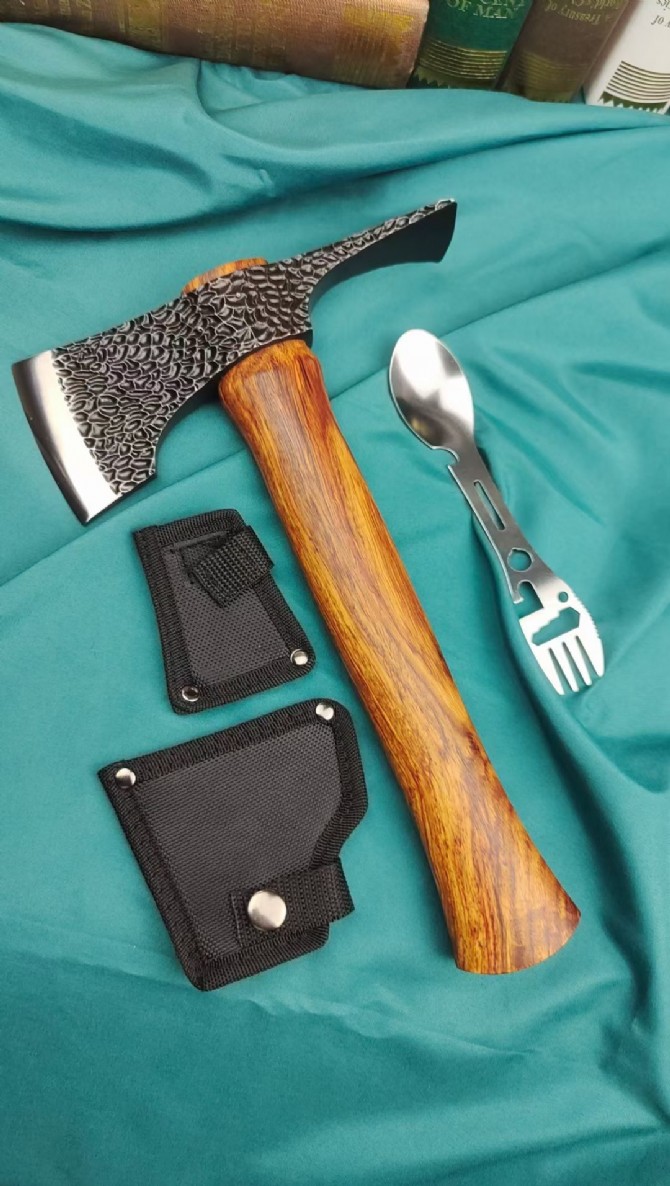 【雷霆·斧】[福]收藏精品!斧头界性价比的天花板”大师作品!唯美独特(斧)字 谐音‘’福字‘’,送朋友送自己是一种集福气,富贵于一身,同时斧头也在古代属于辟邪赈灾之物,也有庇佑孩子平安的意思含义!纯手工制作出品,首批80把,采用进口DC53合金钢[强]硬度60-62HRC,由上海专业真空深冷热处理,表面特色复古锻打锤纹+手工拉丝效果,手工多次反复研磨,蛤式开刃,蛤刃的好处是耐切耐砍耐削,同时日常日用打磨,锋利度极高,轻松切纸等砍劈作业。手柄做工:全手工骧制一体微粒黄檀木,每条木材精挑细选打磨成形,握手感舒畅充实。皮套:进口意大利