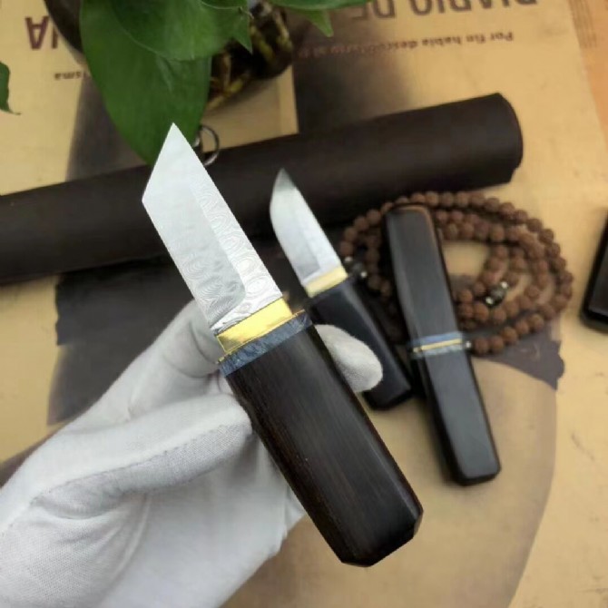 肥守小武士 特惠价数量有限!不要怀疑好不好,收到货包你满意,无论做工用料都是非常不错配置!平时收藏或者是户外使用都非常实用,安全!放在家可以镇宅摆设也是很高的档次!天然名贵黑檀木独一无二,每一把都是手工师傅匠心之作!好货!喜欢尽快下手!品牌:【肥守小武士/几何头】全长:14cm、刃长:7cm、柄长:6.5cm、刃宽:2.2cm、厚度:3mm、钢材:进口锻造无钢芯层大马士革钢,硬度:60-61HRC,真空热处理,表面抛光效果,开刃方式:水冷手工二次开刃,柄材:名贵黑檀木+进口固化稳定木材隔片,鞘:黑檀木,包装:黄色盒子包装!004