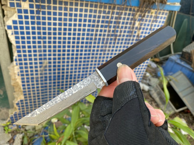 一款风靡国内外的日式武士风格刀,新版本采用大马士革钢,真空热处理,老师傅二次开刃,非常锋利,一体龙骨入柄,手柄采用黑檀木,原木一体刀柄手感极佳!纹理颜色一致!全手工研磨制作!总长:23.3cm,刃长10.6cm 柄长10.9 ,刃厚2.3mm,刃宽:1.6cm,钢材:,大马士革钢 硬度:58/真空热处理,表面处理:大马士革钢原纹!柄材;黑檀木,刀鞘:黑檀木料,包装:礼品盒