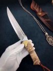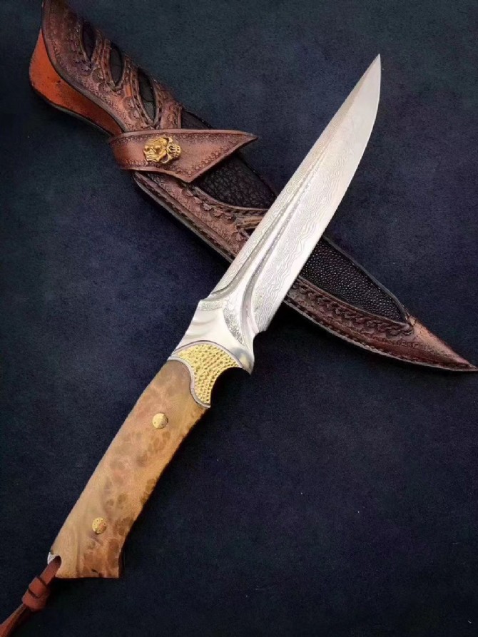 由国内大师原创出版!首批数量95把,珍藏高端品质,好货数量不多,老师傅全手工研磨工艺完成,线条优美流畅,钢料采用//进口锻造一体龙骨大马钢结构设计,真空深冷热处理,回火处理,保持韧性稳定,实物测试硬度60-61HRC之间,使用中不易出现卷刃以及蹦口现象,手柄做工部件//不锈钢头精雕小槽镶嵌黄铜金属,后期手工锤打保留原纹,整体造型自然而且不失档次,搭配进口稀贵白影木,每条木纹独一无二搭配制作,细节做工非常不错,收藏极精品心动的不要错过。全长:26cm,刃长:13.5cm、钢厚度:3.5MM,刃宽:3cm、手柄长度:12.5cm,刃钢材:进口锻造一体龙骨大马士革钢,硬度:60-61HRC,热处理:真空深冷热处理,回火等工序,手柄材质:不锈钢头+黄铜+稀贵白影木材,【皮套:进口意大利手工雕花缝制皮套镶嵌鸵鸟皮+魔鬼珍珠鱼皮】包装:黑手工礼盒。
