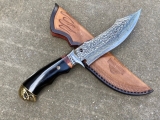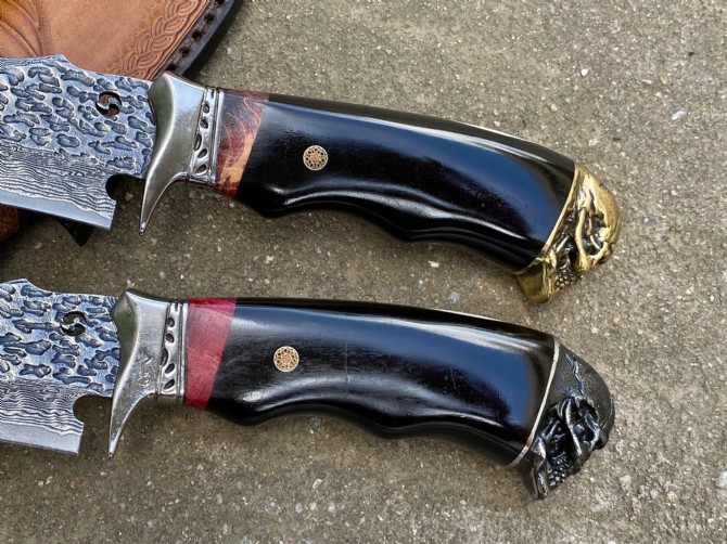 【哈雷-匪帮骑士】HALLEY KNIFE震撼上市,高品质美版Halley - handmade Damascus knife美国公司订单授权,出口正品手工大马士革直刀 哈雷【匪帮骑士】、每一把刀师傅都用心制作,以匠心精神做好每一把刀,每一把刀都给你一种非凡不同的灵魂 、手工味浓,既实用同时也是一件工艺艺术品!总长:27CM ,刃长:13CM ,刃厚:4.5MM ,刃宽:4CM ,钢材:公司提供进口锻造大马士革钢VG10钢芯103层,工艺:复古怀旧工艺,表面保留锻造捶打凹凸纹理,热处理:专业真空热处理,淬火回火、硬度:60-62HRC ,开刃方式,水冷多次开刃,设计以锋利度为主,保持性较好,重量:276G ,手柄:黑檀木+稳定木+牛骨,骨架形体+合金骷髅头,皮套:意大利手工大师手作,纯手工雕花缝线,复古棕色工艺,手工雕刻图案。包装:复古手工盒子包装此款由哈雷摩托公司推出全新大马士革手工刀定制合作款!出口纪念版!