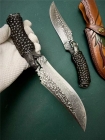 【响尾蛇】独特美观纯手作,家居办公镇宅辟邪神器,高端的作品。每一把设计到完成耗时漫长,喜欢的不要错过,刀片采用进口锻造大马士革钢(祥云抛光纹)真空加热处理过,经二次手工开刃保持耐久锋利、适用砍/割/等户外活动,手柄挡手镶嵌(蛇头+蛇尾 雕刻物件)、响尾蛇是一款高端品质猎刀,刀友们精品绝不可错过、全长:28cm、刃长:15cm、柄长:13cm刃钢材:大马士革钢、刃厚度:4.2mm硬度:60HRC,手柄材质:发黑雕刻蛇头+黑檀木+发黑雕刻蛇尾,包装:手工盒