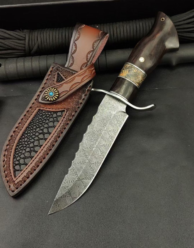 精品【日渊博弈】9Cr18Mov一体钢深冷处理高硬度60HRC+老树黑檀木镶嵌固化稳定木手柄+花铜钉贯穿加固一体龙骨成型。,石印工艺精品猎刀佩手工植鞣压花牛皮套。表面石印+腐蚀雕刻刃面,做工精细,12道工序手工开刃二次研磨,锋利异常用料高端实在!黑礼盒包装,送刀油+刀布。