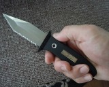 Discovery探索频道《荒野求生》(Man VS wild)系列节目主持人的贝尔·格里尔斯自己设计的野外求生直刀之一,自己签名发售!贝尔不是每次都带一样的刀,有时候带全刃的,有时候带半齿的,总的来说,半齿的对付韧物还是占优势,像树藤,麻绳什么的,全刃的方便打理一点,磨得时候方便一些,具体的取舍,还是看使用者本身的偏好了