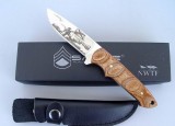 类 型: 小型直刀 全 长: 19cm 刃 长: 8.5cm 刃 宽: 2.5cm(最宽处)柄 长: 10.3cm刃 厚: 0.32cm刃 材: 440C硬 度: 57RHC(高硬度)表 面: 镜光柄 材: 刀身贯穿刀柄,两面夹波浪型彩木净 重: 140克(含套)利 度:锋利其 他:镜光的刀身镭射战斗场面的图案。一体龙骨结构,配牛皮刀套。品 质:高品质