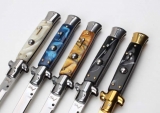 新款9寸AKC意大利黑手党-赌徒跳刀,在电影"教父"里出尽了风头!枪刺刃的黑手党侧跳,仿牛角亚力克柄,弹力超强,锁定到位,440枪刺刀刃镜面,带有保险装置,刀护手处暗藏闭合开关,出口产品,质量保证!满足把玩和收藏需要