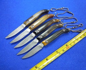 日产大马士革制造,MINI钥匙扣小刀,刀柄用天然花牛角手工打磨成型,配上小链子,可以直接挂钥匙圈上规格全长 11.5CM刃长 4.5CM刃厚 1.5MM 刃材料 日产80层柄材料 天然花牛角重量 25克