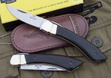 刀柄由黄铜骨架+雕花一体底骨(自动尾簧)组成,刀头精镶白铜和黑牛角。底骨和BUCK钢质LOGO为一体结构。