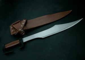 类 型: 战斗刀全 长: 72CM刃 长: 55CM刃 宽: 8CM(最宽处)刀 厚: 0.4CM刃 材: 高碳钢硬 度: 57表 面: 刀身发黑,钢本色刃口水磨处理刀 柄: 全钢绕皮带,合金护手刀 鞘: 人造皮革重 量: 1100克说 明: 电影道具,已开锋.刀拿在手上,非常的顺手。