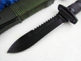从整体外形来看, “丛林刀王”二型的刀型为匕首型,刀背接近刀头处有一段开锋,同样带有背齿,特重于穿刺。刀柄为铝合金制空心管,内藏求生装备,并具防水功能,为该系列刀具次高档型号。刀刃以铆接方式固定在刀柄上,其上刻有品牌,型号,出产编号等。