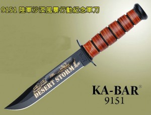 KA-BAR 美国卡巴 9151 沙漠风暴15周年纪念版【US NAVY 皮鞘】表 面: 黑色环氧化物,金色雷射雕刻logo 国内绝对罕见的纪念版 是巴克公司2005年为了纪念沙漠风暴行动(1990年海湾战争)胜利15周年发布的一款新 图案LOGO的纪念刀