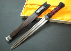 全长:47.3 厘米剑长:28.0 厘米柄长:13.2厘米剑宽:3.3厘米厚度:0.45厘米材质:百炼花纹钢工艺:古法淬火,回火等热处理.花纹钢全手工锻打,十二道手工研磨,剑身为双凹槽,凸起剑脊笔直坚挺。全开刃硬度:58HRC鞘材:酸枝木装材:锌铝古银装柄材:缠丝绵绳硬度:58HRC剑重:500.0克(含鞘)整套:1160.0克(含锦盒)备注:带锦盒和布袋