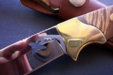 这款刀是勃郎宁非常经典的随身护卫刀,钢材是440C进口日本材料, 手柄采用纯黄铜和影木组合,其中连铆钉都是黄铜的,刀柄的花纹是影木天然特有的,影木是一种非常昂贵的木材,在近期才出现在刀身的应用上.