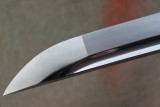 刀刃刃材使用AUS 1095钢,虽然经过反复淬火,却丝毫不影响刀锋的锋利度和保持力,只有当你用手指轻轻沿着它滑过,才会感觉到微小的波动,刀刃可以弯曲90度后,恢复原样,一点都不会有偏差,足以证明钢材的刃性有多完美~刀刃的平刃面(镐)没有刻意抛光到镜面效果,而且也没有回火线。日本刀“打刀”是用来实战而不是观赏,所以它的重点放在品质和设计上面。铜鞘口(鲤口)是用全手工制作抛光而成。手柄上包裹的是真鲛皮,并且用黑线用传统十字交叉方式缠裹。