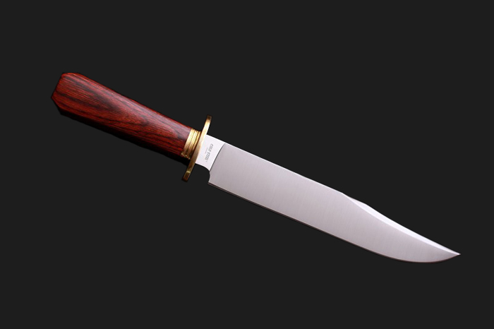 COLD冷钢公司39LLBT。Trail Master1是一把非常大型的全能直鞘刀,适合各种高要求的重型用途。其非常强有力的刀刃用SH-5这种高碳钢材制成,坚硬,抗磨损,能胜任各种重型任务,全铜护手厚5MM,刀刃厚8MM。刀刃和完美抛光的黑色米卡塔手柄体现出浑然一体、不可分割的协调性。精心设计的手柄使Recon Scout既适合劈砍,也适合日常切削。全龙骨柄芯贯穿整个手柄,是极度强劲的野外战斗工具,手柄表面有格状纹路,提供更舒服稳固的把握度。