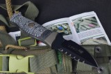 编号2950CW的尖兵系列直刀,氧化处理成黑色之外,出厂时还缠上军绿色尼龙绳,精细的手工让直刀握柄非常舒适而美观。更特别的是随刀附有侧肩挽带(MercHarness),透过这个配件,可将直刀配戴在左侧腋下处,以右手取刀时相当顺势。而且穿上外衣之后,能将刀具隐藏其中不被发现。