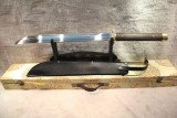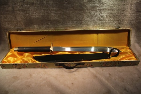 全长:75cm刃长:49cm刃宽:4.5cm刃厚:0.73cm刃材:T10烧刃鞘材:人造皮套装材:黑檀,包铜硬度区间:59—62HRC总重:2340克(含皮套及锦盒)性能:全开锋,削纸断竹砍铁包装: 皮套、锦盒。