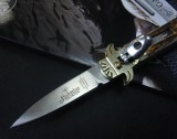 德国Hubertus Solingen 高品质经典的杠杆小跳刀,D2顶级高速工具钢刀刃,刀锋极其锋利,搭配天然鹿角和扎铜护手,花边内衬和骨架,制造精良,不摇头,弹卡到位,通过出口验收标准,极具收藏价值!规格全长 15.5CM刃长 6.5CM刃厚 3MM刃材料 D2高速工具钢硬度 真空热处理,硬度达HRC61 柄材料 花边扎铜护手+天然鹿角重量 85克赠送精美礼盒