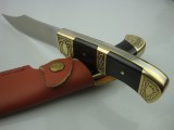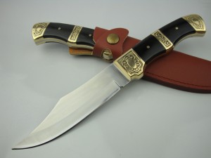 ◇全 长:25.7cm◇刃 长:12.8cm◇柄 长:12cm◇刃 厚:3.0mm◇刃 材:440C◇硬 度:57HRC◇刀 柄:黑木/雕花铜头◇表 面:沙光◇重 量:290.0克(包括皮套)◇备 注:带皮套