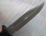 99式空降兵伞刀的外形简洁美观,结构牢固可靠,功能齐全,不仅是空降兵空投、空降和地面作战的利器,也是行军和野外生存的有效工具。全刀主要由刀体、刀柄、刀柄座、刀柄芯杆、横挡护手、指北针、刀鞘、刀鞘镶件、磨刀石、哨子、挂带、腰带挂扣、捆绑绳和保险绳等部分组成。刀身全长320毫米,总重量550克,由刀体和刀柄组成,两部分之间用拉杆连接,采用绝缘结构,刀柄不导电。 刀柄表面刻有网纹和环形槽,不但握持舒适,手感好,而且防滑、绝缘性能好。横截面为实心椭圆形,前段设有横挡护手,护手上有孔。尾部有小型防震指北|针和保险绳。刀柄材料选用黑色高强度工程塑料制成,具有比重轻,强度高,塑性好,耐冲击,耐高低温,耐腐蚀,耐老化等优点。 刀体为锋利的单面刃口,能快速割断降落伞伞绳和其它绳索。刀背有一段坚利锯齿,能锯断f飞机铝壳体和电缆。刀体刻有血槽,刺入敌人身体后,能顺利拔出,同时使刀体重量降低至320克,并增强了刀体的刚度,提高抗弯抗扭能力。刀体材料为高强度防酸高碳不锈钢。为防止刀体反光,提高隐蔽性,表面经喷砂处理使之呈暗灰色。 刀鞘用黑色高强度工程塑料制成,内有弹簧片,保证刀体不会晃动和自动掉落。前部设有泄物孔并系有捆绑绳,平时缠绕在刀鞘上,用时解开绑在腿上将伞刀固定牢靠,也可用绳索将伞刀绑在长杆或树枝上,作为长矛使用。刀鞘背面则镶有磨刀石和联络用哨子,并用织物制作的盖片加以保护。下端有一钢制镶件,装有螺丝刀、开瓶器和开罐头刀。刀鞘挂带用锦纶编织带制作,有金属扣环,能和伞兵携行具配套携带,很方便地从使用者身上将刀鞘取下或装上。为佩带更保险,还使用了尼龙搭扣,保证跳伞时不会脱离。刀鞘虽然配件多,但重量只有230克。