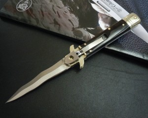 意大利AKC著名手工刀匠Bill Deshilvs设计,经典的杠杆纽扣锁定,弹簧快速打开刀刃,D2顶级高速工具钢刀刃,搭配天然花牛角和铜护手,非常经典,极具收藏价值,出口尾货,售完直至!