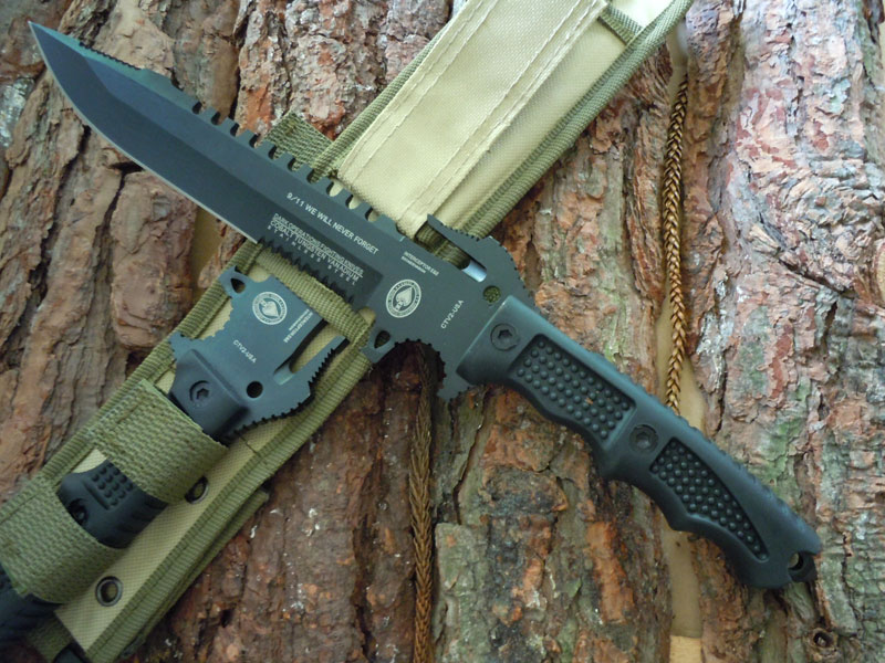 911不仅是为紧急呼叫,它还时刻提醒我们.在我们面对战争之前,我们是为英雄们而战斗! 以9/11致敬限量版命名它的名称,经常的有提醒美国人怀念失去的英勇努们,那些采用武器捍卫自由的人们 设计者为他们提供了组合良好,战斗最佳的武器. ctv2 钢的刃材,刀身长度超过8英寸,锯齿刀头,背齿刀身,使911成为令人难以置信的战斗有效工具. 911的锯齿,背齿,有进一步增强实时逃生和杀伤力.手柄后尖头更适合用于贯穿玻璃,窗户., 护手既是一种开瓶器和又是一个锋利的割绳器,紧急情况将得心应手!带齿的刀刃适合任何场合.大的背齿会使敌人的伤口经久不会愈合. 象所夜魔的刀刃一样,ctv2 钢将持续数十年性能不变. 100%,美国黑鹰出品! 黑色碳氮化钛(三种)真空图层,更有效的防锈,防止各种有腐蚀性物质对刀身的侵蚀.