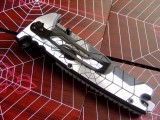 本款极品级半自动折刀,刀刃采用锻打高碳不锈钢制造,有着非一般的锋利度,锻打压花纹理有着原始的美感,配加精心设计的快开(设计)结构,使打开这样一款大折刀成为异常轻松的事情,哪怕你是一个新手!食指轻轻一拨,刀刃就非常精确的卡在锁上,TOA刀尖,非常锐利!手柄的设计也是独具匠心!铝合金压花成蜘蛛吐丝情景,炫镜表面处理,即便是在光线不好的地方也可以使蜘蛛显得栩栩如生!唯妙唯俏!如在大型的折刀开合非常自如,每一次开刀都精确卡位,是少有的极品级半自动折刀!本款折刀乃本地大师级精心打造!