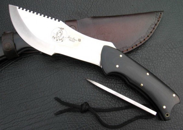 采用7mm优质钢材经线切割工艺开料,后期刀柄及刀体的抛光处理 均由手工精抛细磨而成,整刀非常强悍,制作工艺细致,黑色米卡塔采用铜钉固定并经抛磨光处理后黑光闪烁,越用越光亮。。