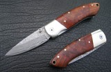 代日本客商生产。正宗大马士革钢刀刃,刀柄精镶红影木和胡桃木。线锁式小刀。整刀用料考究,做工精细。