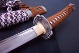 全长 (CM):98刃长 (CM):70柄长 (CM):26刃宽 (CM):3.2刃厚 (CM):0.8刀重(G):1400(含鞘)刃区硬度(HRC):59刀身处理:十道手工研磨,横手做出.锻造工艺:手工锻打刃材:高碳钢柄型:弯柄形柄材:珍珠鲨鱼皮刀装:合金装具.鞘材:原木刀身:经过退火,淬火,回火制作工序,切先流畅,寸法合乎法度,整刀配重合理。刀身弯度比一般武士刀更弯,可以拆卸保养。手工冷磨开刃。附带:黑色棉布袋备注:手工产品数据可能存在少许误差