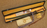 采用高碳工具钢T10(弹簧钢),纯手工锻打,十二道手工精细研磨,锋利度好!敷土烧刃,硬度高,可砍硬币!仿古装具, 青皮木刀鞘,珍珠鱼皮包裹。配高档绸缎刀袋,护刀用具等。 超级高档木质刀盒。专配刀架,镇宅之宝,送礼尚品!