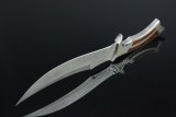 ◇类 型:弯刀◇全 长:33cm◇刃 长:21cm◇刃 宽:3.8cm(最宽处)◇刃 厚:3.3mm◇柄 长:5.2cm◇表 面: 砂光◇刃 材: 7Cr17Mov ◇硬 度: 58HRC◇柄 材: 彩木+双钢头+暗花◇毛 重:574克(含包装)◇包 装:皮套