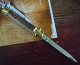 意大利黑手党使用的经典刀具-赌徒跳刀,在电影"教父"里出尽了风头!11英寸(28CM)天然鹿角柄的黑手党侧跳,出刀迅速,锁定稳固,具有超强的穿刺力!带有保险装置,刀护手处暗藏闭合开关,配备牛皮软套,AKC公司出口产品,功能性完工度不错,满足把玩和收藏的需要