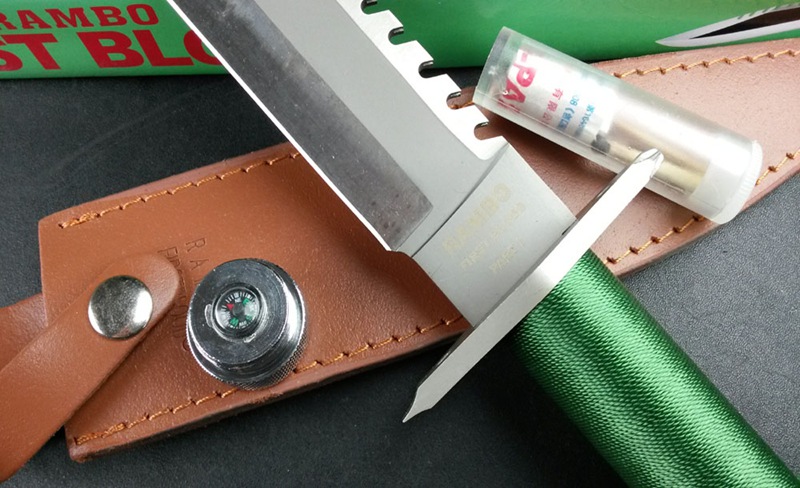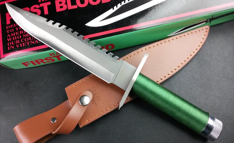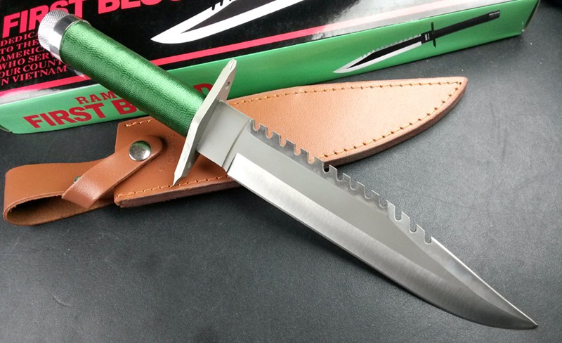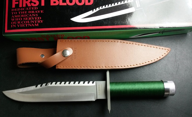 好莱坞电影公司纪念品,《第一滴血》中兰博使用的军刀,ramboI ---由美国联合刀具公司为“史泰龙”主演《第一滴血》而设计生产的一款丛林战斗刀,随着当时《第一滴血》在全球的放映而闻名! 兰博刀身造型适合于切割.劈砍.突刺.刀背有大而强悍的双层大背齿.刀锋十分精细和锋利.护手二端特制成十字和一字起子样.可以用于旋螺丝.手柄为中空全钢用细绳绑捆.握手坚实防滑.柄内有生存附件:有火柴、鱼钩、鱼线、手术刀、罗盘等。