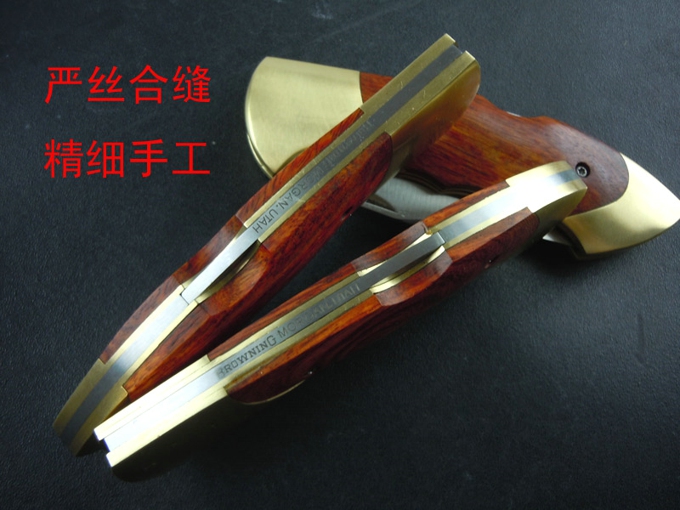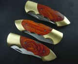 本款经典折刀来自罗斯科莫RUSS kommer)设计,精心设计的精铜柄加红酸枝实木指槽,不仅提供优美的轮廓,还有效增加手感!刀刃采用瑞典sandvik(山特维克)12C27,12C27是高性能的马氏体铬不锈钢,经真空热处理具有高硬度,良好的防锈性,耐磨性,国内比较少用,是优秀的做刀材料!出口的原装货品,手工抛磨精美,刃口锋利,开合顺畅,实木镶嵌精细,区别一般的仿制版本!是背锁款式的精品!