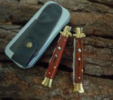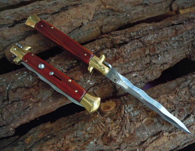 意大利黑手党使用的经典刀具-赌徒跳刀,在电影"教父"里出尽了风头!11英寸(28CM)天然黄檀木柄的黑手党水波刃侧跳,出刀迅速,锁定稳固,具有超强的穿刺力!带有保险装置,刀护手处暗藏闭合开关,配备牛皮软套,AKC公司出口产品,性能优越,满足把玩和收藏的需要。