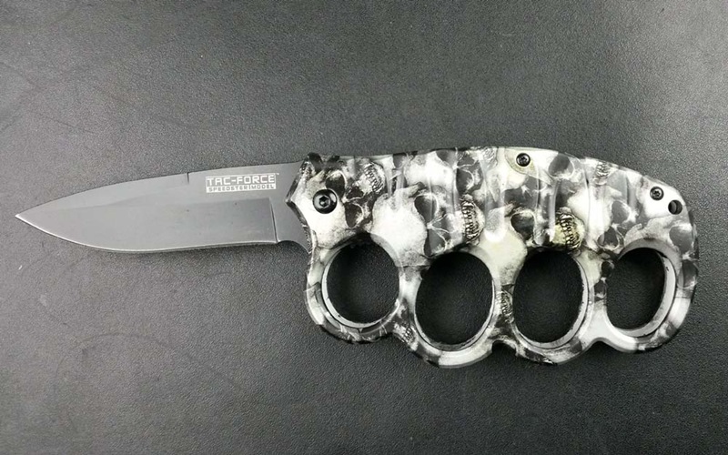 骷髅拳孔防卫刀,拳套跟刀组合,收取刀可以当拳套使用,半自动打开刀刃后威力加倍,带背夹可以方便携带,是理想的防身工具!规 格:CM全 长:21cm刃 长:9cm刀 柄(拳套)长 12cm 款 6.5cm刃 材:3铬13不锈钢柄 材:钢架+铝合金