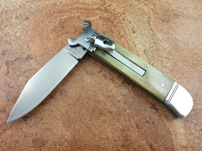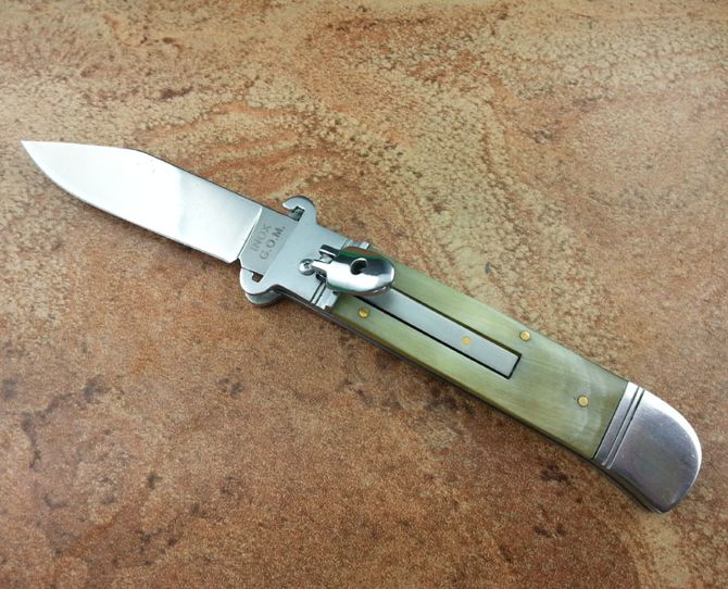 意大利G.O.M古董shell puller 侧跳刀,经典的杠杆纽扣锁定,簧快速打开刀刃,镜面抛光锋刃,搭配天然金牛角和钢护手,非常经典,极具收藏价值规格全长 19.6CM刃长 8.5CM刃厚 3MM刃材料 440硬柄材料 双纯钢护手+金牛角
