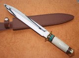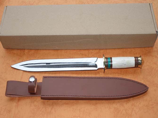 全长:42.5cm刀刃:27.5cm刃厚:0.35cm刃宽:4CM柄长:12.5cm柄材:绿松石+铜头+兽骨柄厚:0.3cm硬度:57HRC毛重:700克(含皮套)表面:超镜光结构:龙骨结构,刀身贯穿刀柄,非常牢固 、皮鞘、纸盒。产地:国内