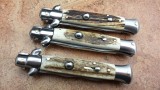 意大利黑手党使用的经典刀具-赌徒跳刀,在电影"教父"里出尽了风头!大马士革蛇刃的黑手党侧跳,弹力超强,锁定到位,大马士革刃(水波纹),带有保险装置,刀护手处暗藏闭合开关,出口产品,质量保证!满足把玩和收藏需要规格全长:22.9mm刃 长:10.2mm柄 长:13cm刃 宽:1.2cm(最宽处)刃 厚:3.0mm刃 材:大马士革刀 柄:天然鹿角开刀方式:弹簧重 量:135克包装:铝盒